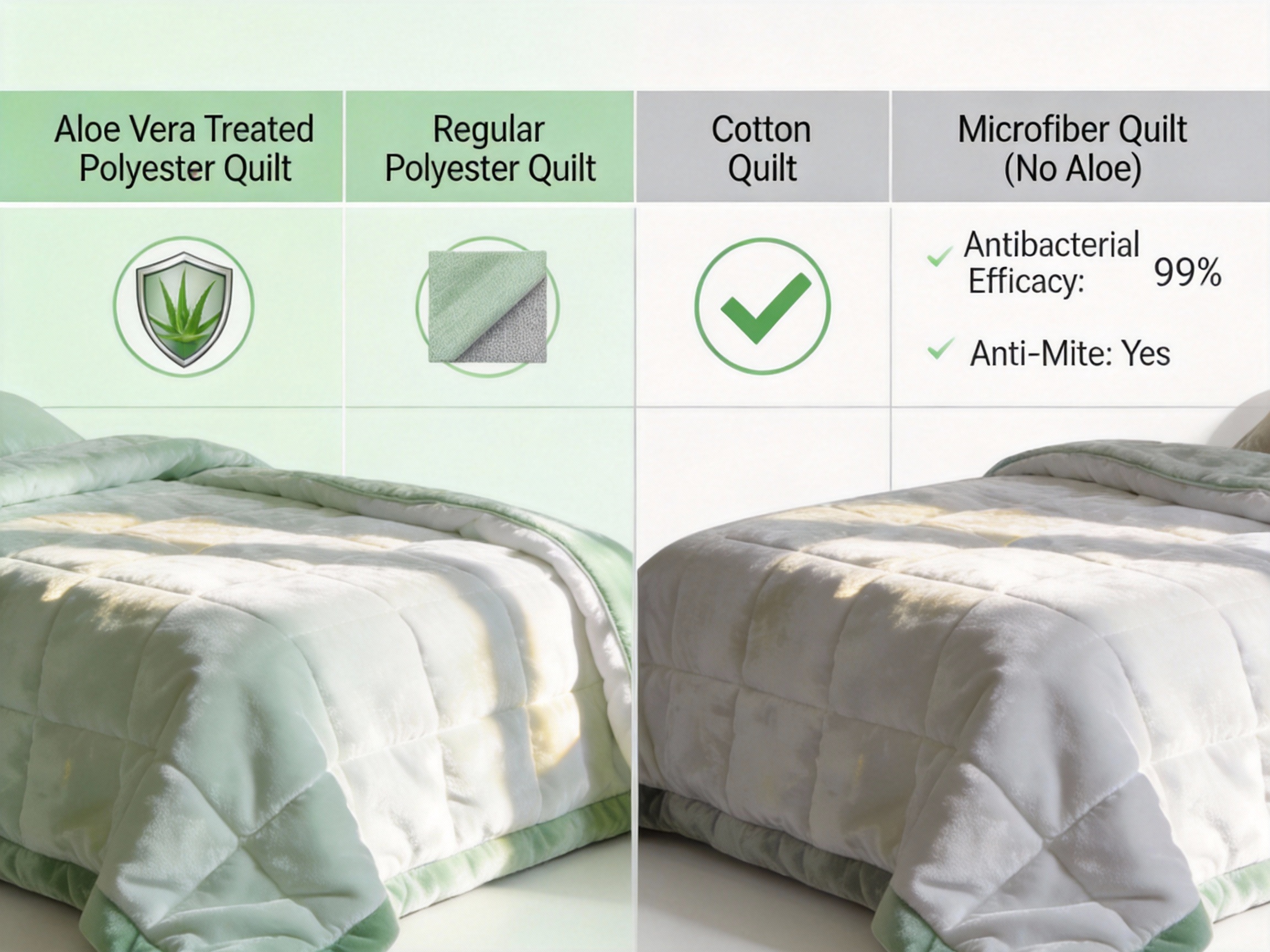| Feature | Aloe Vera Treated Polyester Quilt | Regular Polyester Quilt | Cotton Quilt | Microfiber Quilt (No Aloe Treatment) |