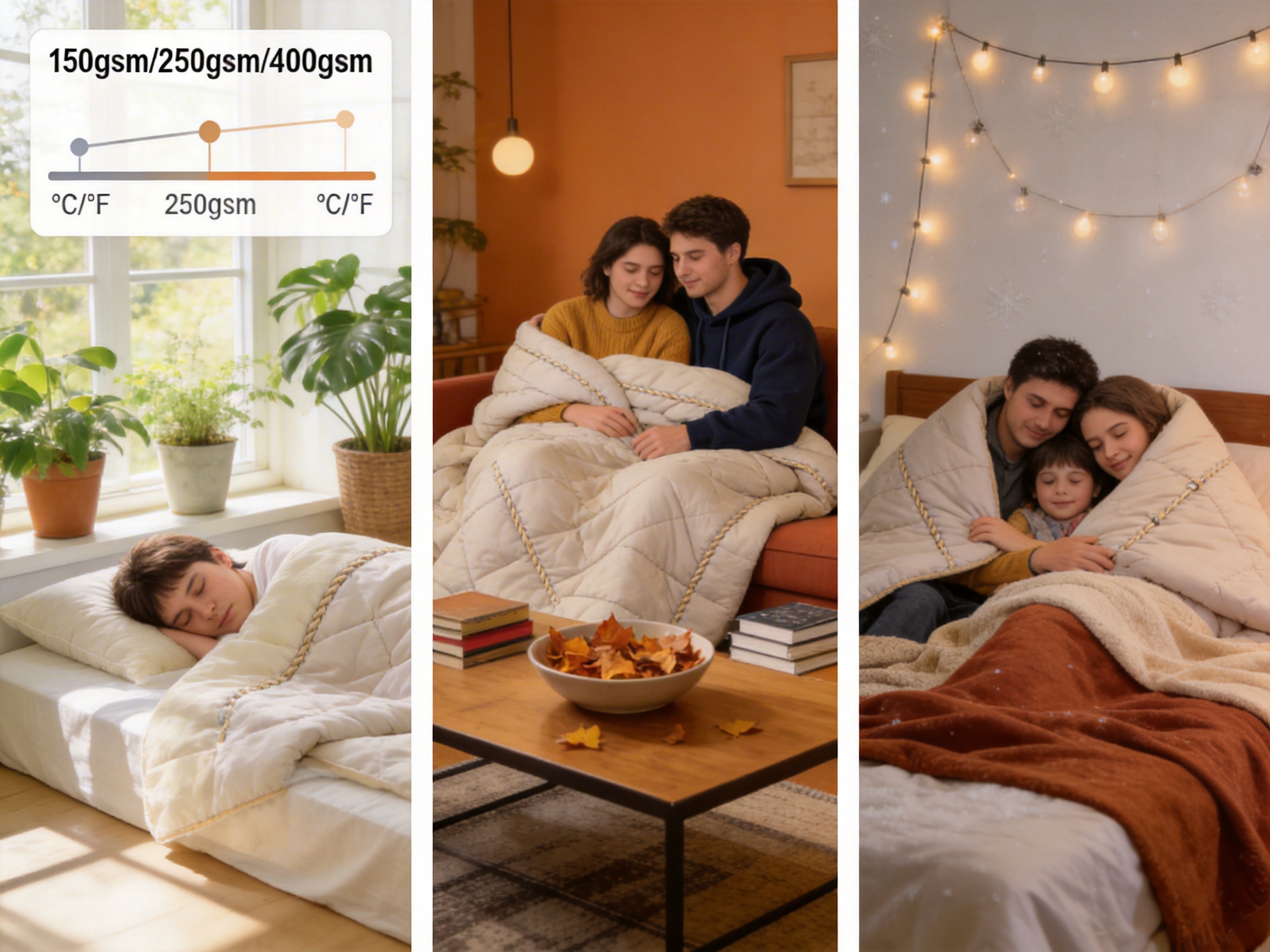 | Weight Options | 150gsm (thin), 250gsm (thick), 400gsm (combined) | Fixed weight (one season) | Fixed combined weight (no separate layers) |